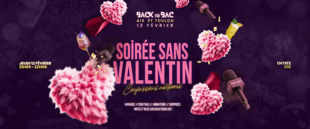 Après le succès de l’édition 2025, BACK to BAC revient avec sa soirée Sans Valentin – Girls Only. Au programme salles de karaoké ouvertes, animations, lots à gagner, cocktails spéciaux et de nombreuses surprises dans 2 de nos établissements. Rendez-vous le 12 février à Aix et Toulon. Places limitées.